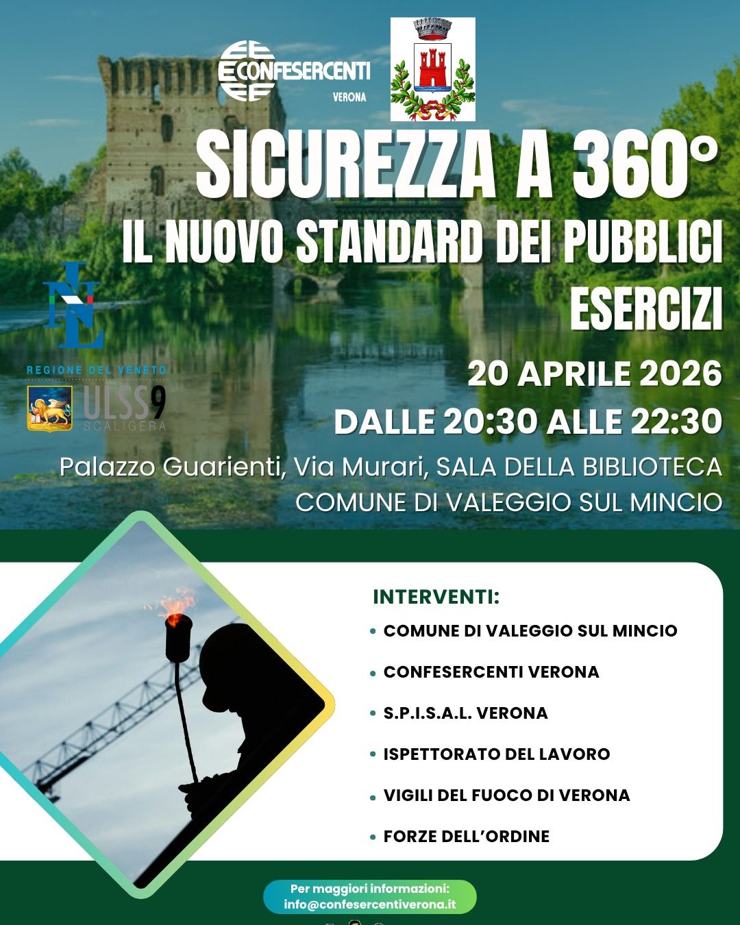 Nel corso della serata interverranno rappresentanti del Comune di Valeggio sul Mincio, Confesercenti Verona, S.P.I.S.A.L. Verona, Ispettorato del Lavoro, Vigili del Fuoco di Verona e Forze dell’Ordine, che approfondiranno i principali aspetti legati alla sicurezza, alla prevenzione e al rispetto delle normative vigenti.